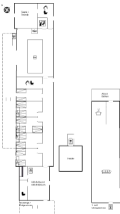 Huset er indrettet så man kan spise sammen ved et langbord som, kan laves kortere eller længere alt efter behov. Der findes flere steder, hvor man kan sidde i bløde møbler og man kan også krybe ind i sit eget hyggelige værelse eller på egen terrasse udenfor.
