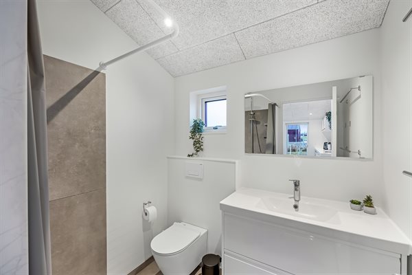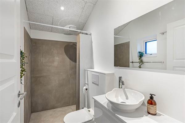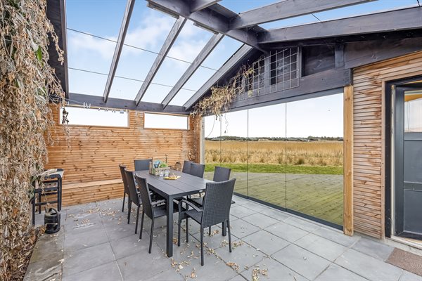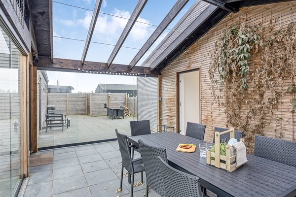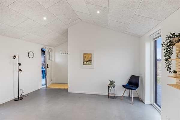 Allerede ved ankomsten mærker du den hyggelige atmosfære. Du træder ind i et charmerende gårdmiljø, hvor der er adgang til en lukket glasudestue - et fantastisk rum med skydedøre, der kan åbnes helt op og invitere naturen indenfor. Herfra er der adgang til selve huset, hvor man mødes af en fin entré og et lille, praktisk bryggers med vaskemuligheder.