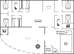 Stor, lækker pool-afdeling med swimmingpool (6,0 x 3,0 x 1,4 m) med modstrømsanlæg, børnepool med vandrutschebane, 2-pers. spa og adgang til badeværelse med bruseniche. Fra dette badeværelse er der desuden direkte adgang til husets sauna. Ekstra, dejligt badeværelse med bruseniche.