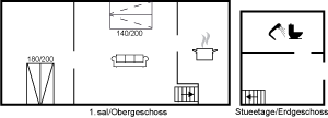 Lejligheden er indrettet i 2 plan med badeværelse samt entré i stueplan og de øvrige rum på 1. sal.